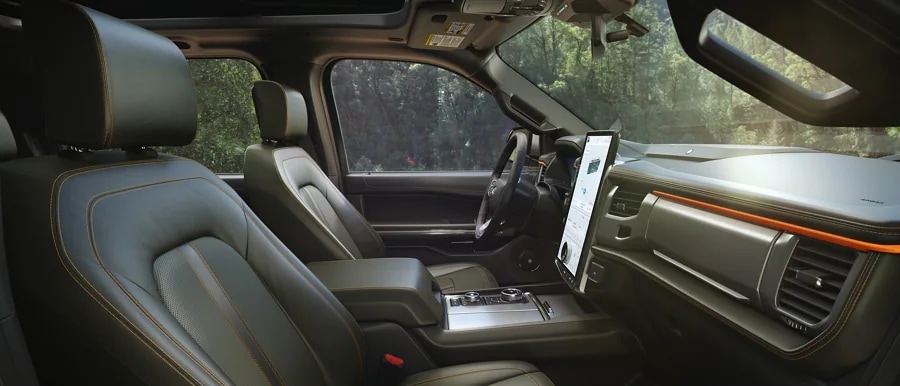 The 2024 Ford Expedition Timberline has exclusive interior trim details and colors, including ActiveXâ„¢ trimmed seats with heathered cloth insert or available leather-trimmed seats, Deep Tangerine stitching and the Timberline logo. The same stitching is also found on the door trim and on the heated, leather-wrapped steering wheel.