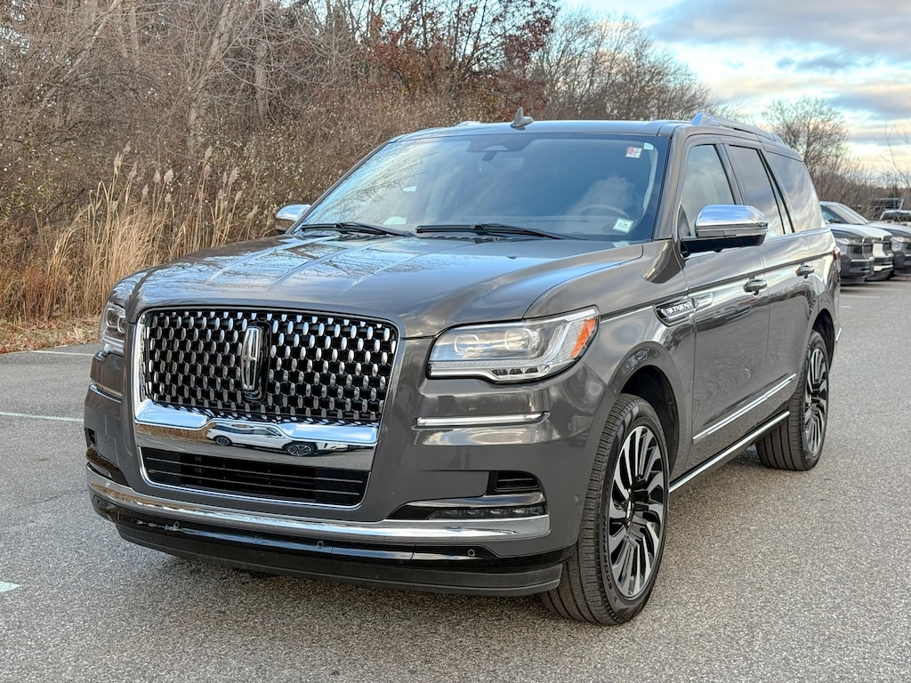 Certified. Dark Gray Metallic 2024 Lincoln Navigator Black Label 4WD 10-Speed Automatic V6 Dealer Detailed, Oil Change, Dealer Inspected, 28 Speakers, 3.73 Axle Ratio, 3rd row seats: split-bench, 4-Wheel Disc Brakes, ABS brakes, Adaptive suspension, Adjustable pedals, Air Conditioning, Alloy wheels, AM/FM radio: SiriusXM with 360L, Apple CarPlay/Android Auto, Audio memory, Auto High-beam Headlights, Auto Start-Stop Technology, Auto tilt-away steering wheel, Auto-dimming door mirrors, Auto-dimming Rear-View mirror, Auto-leveling suspension, Automatic temperature control, Bodyside moldings, Brake assist, Bumpers: body-color, Compass, Delay-off headlights, Driver door bin, Driver vanity mirror, Driver's Seat Mounted Armrest, Dual front impact airbags, Dual front side impact airbags, Electronic Stability Control, Emergency communication system: 911 Assist, Exterior Parking Camera Rear, Floor Carpet/Mats - Espresso w/Dinamica Suede, Four wheel independent suspension, Front anti-roll bar, Front Bucket Seats, Front dual zone A/C, Front fog lights, Front reading lights, Fully automatic headlights, Garage door transmitter, Genuine wood console insert, Genuine wood door panel insert, Head restraints memory, Headliner - Alpine Dinamica Suede, Heads-Up Display, Heated door mirrors, Heated front seats, Heated rear seats, Heated steering wheel, HVAC memory, Illuminated entry, Lane Departure Warning System, Leather steering wheel, Leather-Wrapped Interior - Alpine w/Black Stitch, Low tire pressure warning, Memory seat, Navigation system: Connected Navigation (1-year trial), Occupant sensing airbag, Outside temperature display, Overhead airbag, Overhead console, Panic alarm, Passenger door bin, Passenger seat mounted armrest, Passenger vanity mirror, Pedal memory, Power adjustable front head restraints, Power adjustable rear head restraints, Power door mirrors, Power driver seat, Power Liftgate, Power moonroof: Panoramic Vista Roof, Power passenger seat, Power steering, Power windows, Radio data system, Radio: Revel Ultima 3D Audio System w/28 Speakers, Rain sensing wipers, Rear air conditioning, Rear anti-roll bar, Rear audio controls, Rear reading lights, Rear seat center armrest, Rear window defroster, Rear window wiper, Reclining 3rd row seat, Remote keyless entry, Security system, Silverwood Recon Appliques, SiriusXM w/360L, Speed control, Speed-sensing steering, Speed-Sensitive Wipers, Split folding rear seat, Spoiler, Steering wheel memory, Steering wheel mounted audio controls, SYNC 4 Communications & Entertainment System, Tachometer, Telescoping steering wheel, Tilt steering wheel, Traction control, Trip computer, Turn signal indicator mirrors, Variably intermittent wipers, Venetian Lthr Auto Htd/Ventilatd Capt's Chairs (B), Ventilated front seats, Ventilated rear seats, Voice-Activated Touchscreen Navigation System, Wheels: 22" 14-Spoke Bright Machined Aluminum.