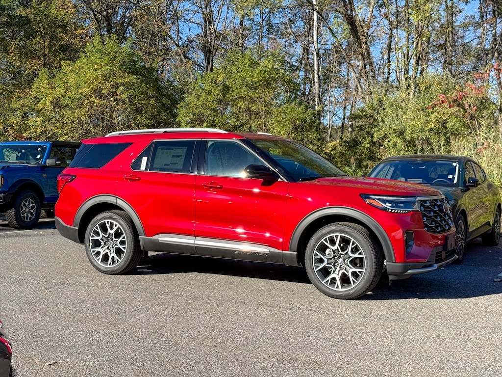 Rapid Red Metallic Tinted Clearcoat 2025 Ford Explorer Platinum 4WD 10-Speed Automatic 3.0L EcoBoost V6 Dealer Detailed, Oil Change, Dealer Inspected, 14 Speakers, 3.58 Non-Limited Slip Rear Axle, 3rd row seats: bench, 4-Wheel Disc Brakes, ABS brakes, ActiveX Trimmed Sport Captain's Chairs, Air Conditioning, Alloy wheels, AM/FM radio: SiriusXM with 360L, Apple CarPlay/Android Auto, Auto High-beam Headlights, Auto-dimming door mirrors, Auto-dimming Rear-View mirror, Automatic temperature control, Brake assist, Bumpers: body-color, Compass, Delay-off headlights, Driver door bin, Driver vanity mirror, Dual front impact airbags, Dual front side impact airbags, Electronic Stability Control, Emergency communication system: 911 Assist, Equipment Group 600A Standard Package, Exterior Parking Camera Rear, Ford BlueCruise Equipped (1-Year Plan) (DISC), Four wheel independent suspension, Front & 2nd Rows Floor Liners w/Carpet Floor Mats, Front anti-roll bar, Front Bucket Seats, Front Center Armrest, Front dual zone A/C, Front fog lights, Front License Plate Bracket, Front reading lights, Fully automatic headlights, Garage door transmitter, Heated door mirrors, Heated front seats, Heated rear seats, Heated steering wheel, Illuminated entry, Knee airbag, Leather Seating Surfaces Sport Captain Chairs, Leather steering wheel, Low tire pressure warning, Lux Leather Package, Memory seat, Navigation System, Occupant sensing airbag, Outside temperature display, Overhead airbag, Overhead console, Panic alarm, Passenger door bin, Passenger vanity mirror, Platinum Badges on Front Row Seats, Power door mirrors, Power driver seat, Power Liftgate, Power moonroof, Power passenger seat, Power steering, Power windows, Quilting & Stitching on Door Panels, Quilting & Stitching on Seats, Radio data system, Radio: B&O Sound System by Bang & Olufsen w/HD, Rain sensing wipers, Rear air conditioning, Rear anti-roll bar, Rear reading lights, Rear window defroster, Rear window wiper, Remote keyless entry, Security system, Speed control, Speed-sensing steering, Speed-Sensitive Wipers, Split folding rear seat, Spoiler, Steering wheel mounted audio controls, Tachometer, Telescoping steering wheel, Tilt steering wheel, Traction control, Trip computer, Turn signal indicator mirrors, Ultimate Package, Variably intermittent wipers, Ventilated front seats, Wheels: 20" Luster Nickel-Painted Aluminum, Wheels: 21" Dark Alloy-Painted Machined Aluminum.