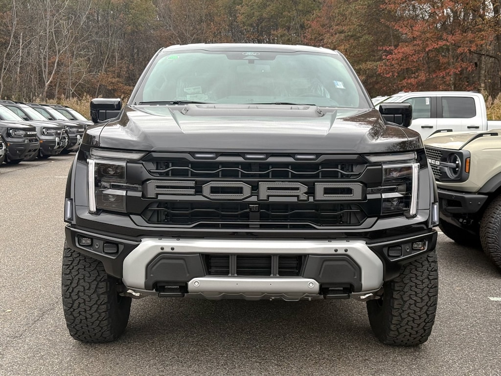 Agate Black Metallic 2025 Ford F-150 Raptor 4WD 10-Speed Automatic 3.5L V6 EcoBoost Dealer Detailed, Oil Change, Dealer Inspected, 14 Speakers, 17" Cast Aluminum Wheels, 4-Wheel Disc Brakes, ABS brakes, Adjustable pedals, Air Conditioning, Alloy wheels, AM/FM radio: SiriusXM with 360L, Auto High-beam Headlights, Auto tilt-away steering wheel, Auto-dimming door mirrors, Auto-dimming Rear-View mirror, Automatic temperature control, Brake assist, Bumpers: body-color, Carbon Fiber Interior Appliques, Compass, Delay-off headlights, Driver door bin, Driver vanity mirror, Dual front impact airbags, Dual front side impact airbags, Dual Valve Shocks, Electronic Locking w/4.10 Axle Ratio, Electronic Stability Control, Emergency communication system: SYNC 4 911 Assist, Equipment Group 802A Raptor 37, Front anti-roll bar, Front Bucket Seats, Front Center Armrest, Front dual zone A/C, Front fog lights, Front License Plate Bracket, Front reading lights, Front wheel independent suspension, Fully automatic headlights, Garage door transmitter, Heads-Up Display, Heated door mirrors, Heated front seats, Heated rear seats, Heated steering wheel, Illuminated entry, Lane Departure Warning System, Leather steering wheel, Leather Trimmed Seats, Low tire pressure warning, Memory seat, Modular Front Bumper, Navigation system: Connected Navigation, Occupant sensing airbag, Outside temperature display, Overhead airbag, Overhead console, Panic alarm, Passenger door bin, Passenger vanity mirror, Pedal memory, Power door mirrors, Power driver seat, Power passenger seat, Power steering, Power windows, Radio data system, Radio: B&O Unleashed Sound System by Bang & Olufsen, Rain sensing wipers, Rear reading lights, Rear step bumper, Rear window defroster, RECARO Alcantara Suede Front Seats, Remote keyless entry, Security system, Speed control, Speed-sensing steering, Split folding rear seat, Steering wheel memory, Steering wheel mounted audio controls, SYNC 4 w/Enhanced Voice Recognition, Tachometer, Telescoping steering wheel, Tilt steering wheel, Traction control, Trip computer, Turn signal indicator mirrors, Variably intermittent wipers, Ventilated front seats, Wheels: Raptor 37 Unique 17" Cast Aluminum.