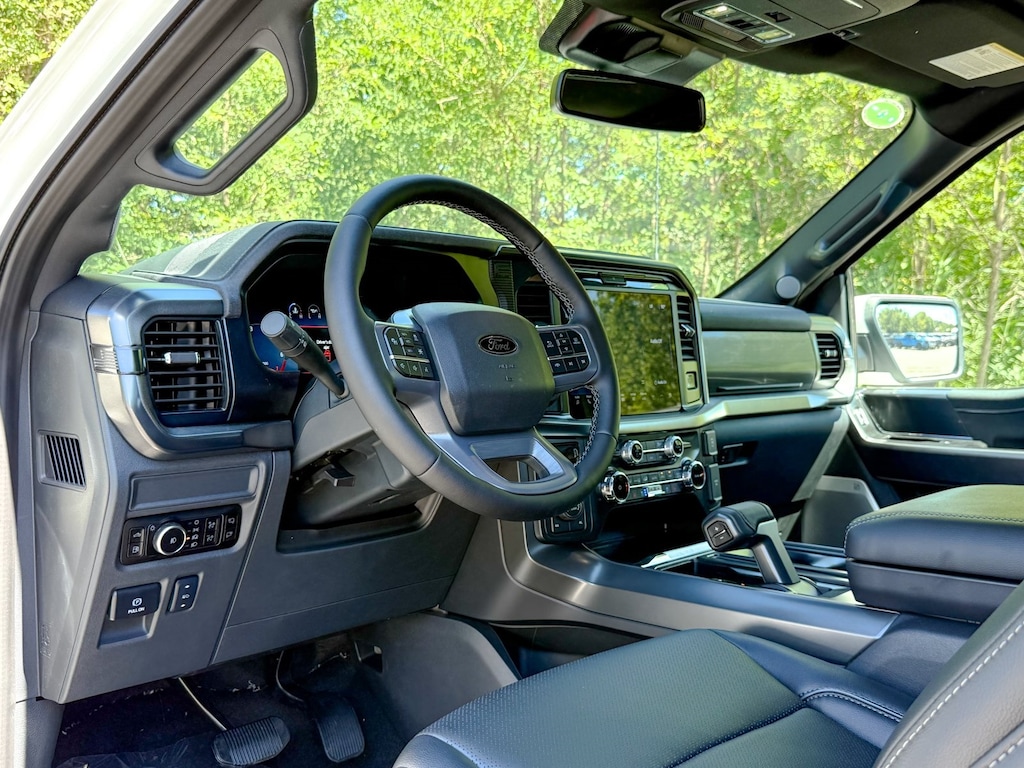 White Metallic 2025 Ford F-150 Lariat 4WD 10-Speed Automatic 3.5L PowerBoost Full-Hybrid V6 Dealer Detailed, Oil Change, Dealer Inspected, 4 Pickup Box Tie-Down Plates, 4-Wheel Disc Brakes, 6" Extended Running Boards, 8 Speakers, ABS brakes, ActiveX Trimmed Bucket Seats, Adjustable pedals, Air Conditioning, Alloy wheels, AM/FM radio: SiriusXM with 360L, Auto High-beam Headlights, Auto-dimming door mirrors, Auto-dimming Rear-View mirror, Automatic temperature control, Bed Utility Package, Brake assist, Bumpers: chrome, Chrome wheels, Compass, Delay-off headlights, Driver door bin, Driver vanity mirror, Dual front impact airbags, Dual front side impact airbags, Electronic Stability Control, Emergency communication system: SYNC 4 911 Assist, Equipment Group 502A High, Front anti-roll bar, Front Bucket Seats, Front Center Armrest, Front dual zone A/C, Front fog lights, Front reading lights, Front wheel independent suspension, Fully automatic headlights, Garage door transmitter, Heated door mirrors, Heated front seats, Heated steering wheel, Illuminated entry, LED Box Lighting, Low tire pressure warning, Memory seat, Navigation system: Connected Navigation, Occupant sensing airbag, Outside temperature display, Overhead airbag, Overhead console, Panic alarm, Passenger door bin, Passenger vanity mirror, Pedal memory, Power door mirrors, Power driver seat, Power passenger seat, Power steering, Power Tailgate, Power windows, Pro Access Tailgate, Pro Power Onboard - 7.2KW, Radio data system, Radio: B&O Sound System by Bang & Olufsen, Rain sensing wipers, Rear reading lights, Rear seat center armrest, Rear step bumper, Rear window defroster, Remote keyless entry, Security system, Speed control, Split folding rear seat, Steering wheel mounted audio controls, SYNC 4 w/Enhanced Voice Recognition, Tachometer, Telescoping steering wheel, Tilt steering wheel, Tow/Haul Package, Traction control, Trip computer, Turn signal indicator mirrors, Twin Panel Moonroof, Variably intermittent wipers, Ventilated front seats, Voltmeter, Wheels: 18" Chrome-Like PVD, Wheels: 20" Chrome-Like PVD.