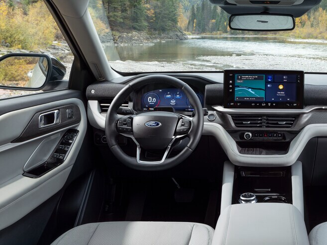 With its spacious and versatile interior, the 2025 Ford Explorer is ready for all of life's adventures. It offers seating for up to seven passengers across three rows. Behind the third row, you'll find 18.2 cubic feet of cargo space, expanding to 87.8 cubic feet with the second and third rows folded. The Explorer can also tow up to 5,600 pounds when properly equipped, allowing you to bring along a boat or camper. For off-road excursions, the available Terrain Management System optimizes performance based on the selectable drive mode.